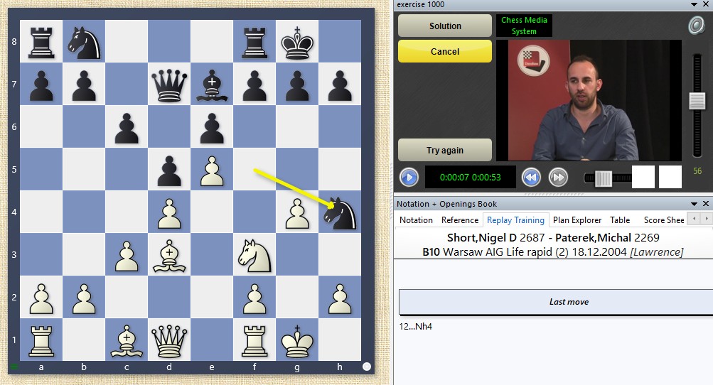 Gut gefällt mir, dass der Autor seine Analyse-Videos noch mit vier Übungen im interaktiven FritzTrainer-Format ergänzt, bei denen wir das Erlernte gleich testen können: