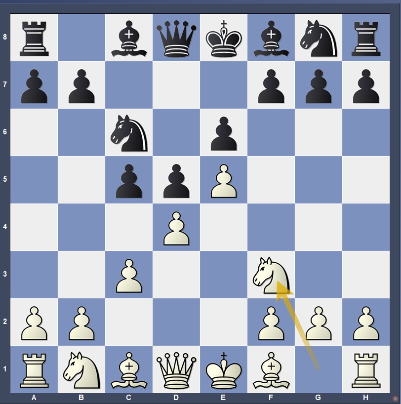 Die häufigste Variante ist 3…Sf6, die wir mit einer Überleitung in die Steinitz-Variante mit Sf3 beantworten: 4.e5 Sfd7 5.d4: