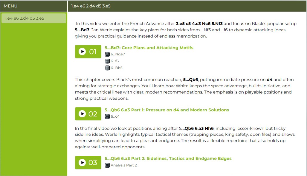 In drei Videos stellt der Autor nicht nur die wichtigsten Varianten vor, sondern beschreibt auch die taktischen Ideen und strategischen Pläne, die sich hinter diesen Varianten verbergen. Er bespricht die Varianten dabei teilweise sehr ausführlich und in großer Tiefe, was es für den Zuschauer nicht immer einfach macht, den Ausführungen zu folgen. Daher eignet sich der Kurs meiner Meinung nach eher für fortgeschrittene Spieler und Spielerinnen. Auf der anderen Seite bekommt man mit diesem Kurs aber ein aktuelles Repertoire gegen Französisch in kompakter Form.