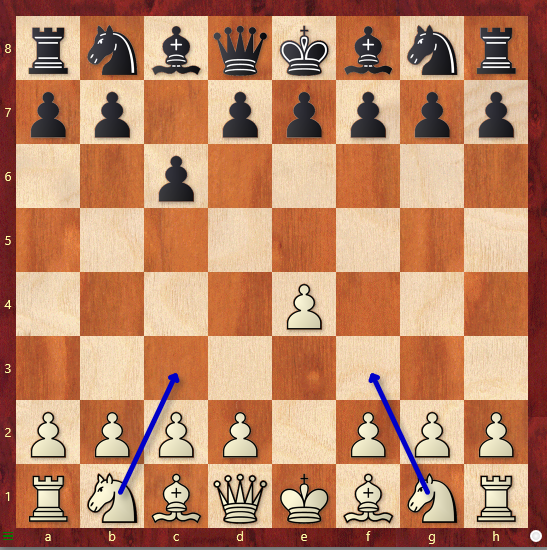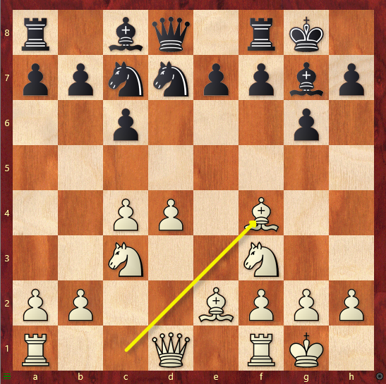 Das ist der Aufbau, der fast unabhängig vom gegnerischen Spiel angestrebt wird. Weiß hat wieder einmal als erstes rochiert, trotzdem scheinen die weißen Leichtfiguren nicht sonderlich aktiv. Doch das ändert sich bald.