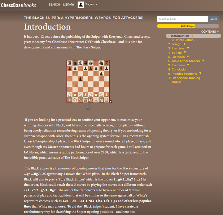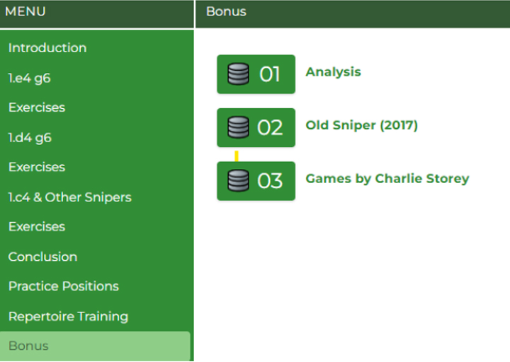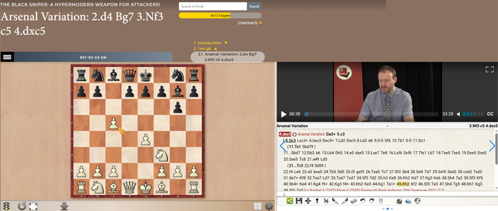 „Der ´Black Sniper´ ist zurück – schärfer und tödlicher als je zuvor! Dieses dynamische System (1...g6, 2...Lg7, 3...c5 gegen 1.e4, 1.d4 und 1.c4) schafft unvorhersehbare, unter hohem Druck stehende Stellungen, sodass die Gegner Schwierigkeiten haben, sich anzupassen“, heißt es im Intro dieses Kurses. Tatsächlich ist die Neuauflage des Kurses eine wunderbare Ergänzung zur ersten Veröffentlichung aus dem Jahre 2017. Es handelt sich dabei keineswegs um eine Neubewertung der Varianten von vor acht Jahren, sondern um eine Entwicklung des Systems in Zeiten ständig stärker werdender Schachengines.