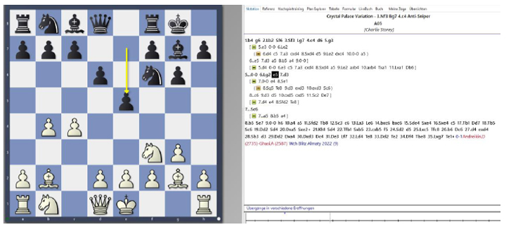 Sehr gut gefallen hat mir besonders das vorgestellte System gegen 1.b4, was mein Vereinskamerad FM Olaf Steffens immer wieder erfolgreich gegen mich anwendet. Olaf ist der „King of langbeinige Läufer“ bei uns im Verein und Storey empfiehlt dagegen einen Königsindischen Aufbau mit d6 und e5, um den Läufer auf b2 zu neutralisieren.
