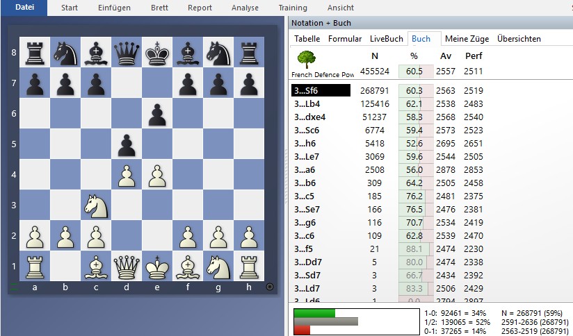 Unverzichtbar für das Studium von Eröffnungen sind für die „PowerBooks“ (Eröffnungsbücher) von ChessBase. Hier bekommt man bis zu einer Tiefe von ca. 20 Zügen den aktuellen Stand der Eröffnungstheorie in einer statistischen Auswertung. Man öffnet eine Partie oder auch nur das Brettfenster und schaltet sich im Reiter „Buch“ das passende PowerBook dazu. Das Bild zeigt die Auswertung der möglichen schwarzen Züge nach 3.Sc3 über das French Powerbook.