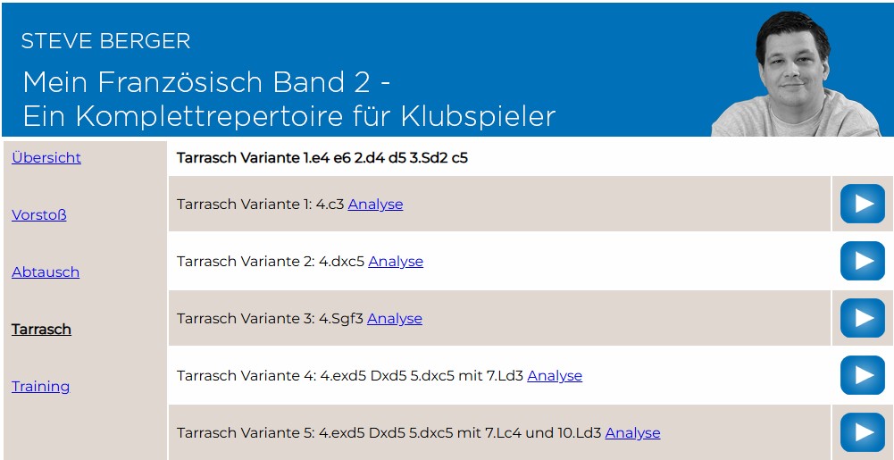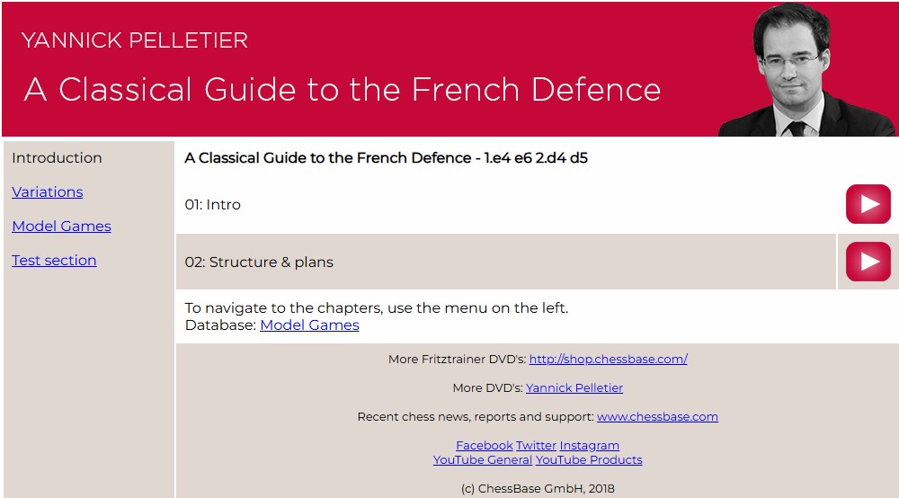 Yannick Pelletier teilt seinen Kurs in die Kapitel Introduction, Variations, Model Games und Test Section. Seine Auswahl der Varianten ist ganz bewusst „klassisch“ gehalten. Der Kurs ist in einer englischen und in einer französischen Version (im Shop die Sprache wählen!) erhältlich.
