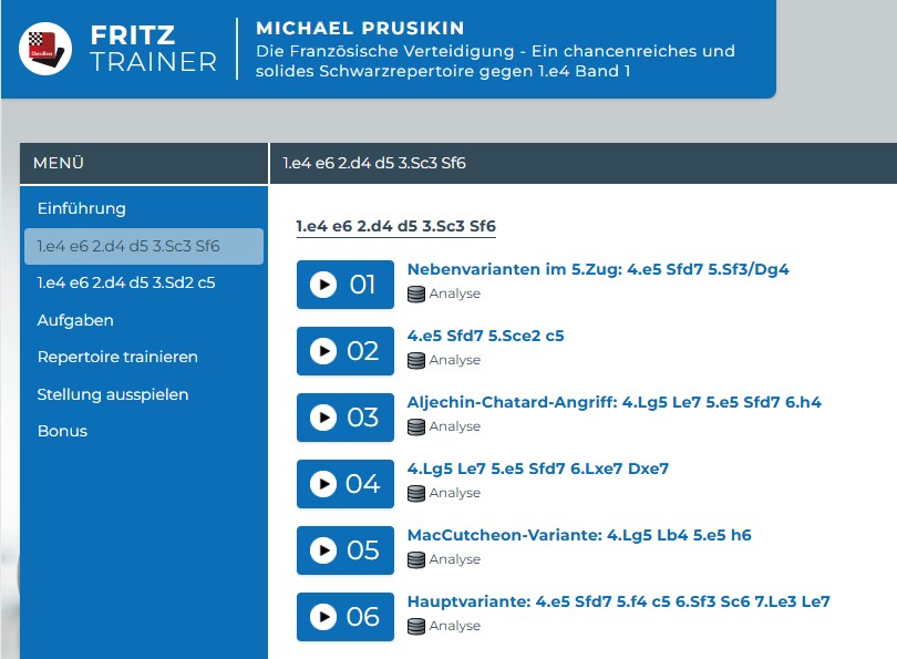 In der folgenden Übersicht möchte ich Ihnen einige der aktuellen und teilweise auch schon etwas älteren FritzTrainer zur Französischen Eröffnung vorstellen und auf Basis der Sprachversion, den empfohlenen Varianten sowie des Niveaus einordnen. Sie finden am Ende dieses Beitrags eine Liste der Kurse mit den Links zum Produkt im Shop.