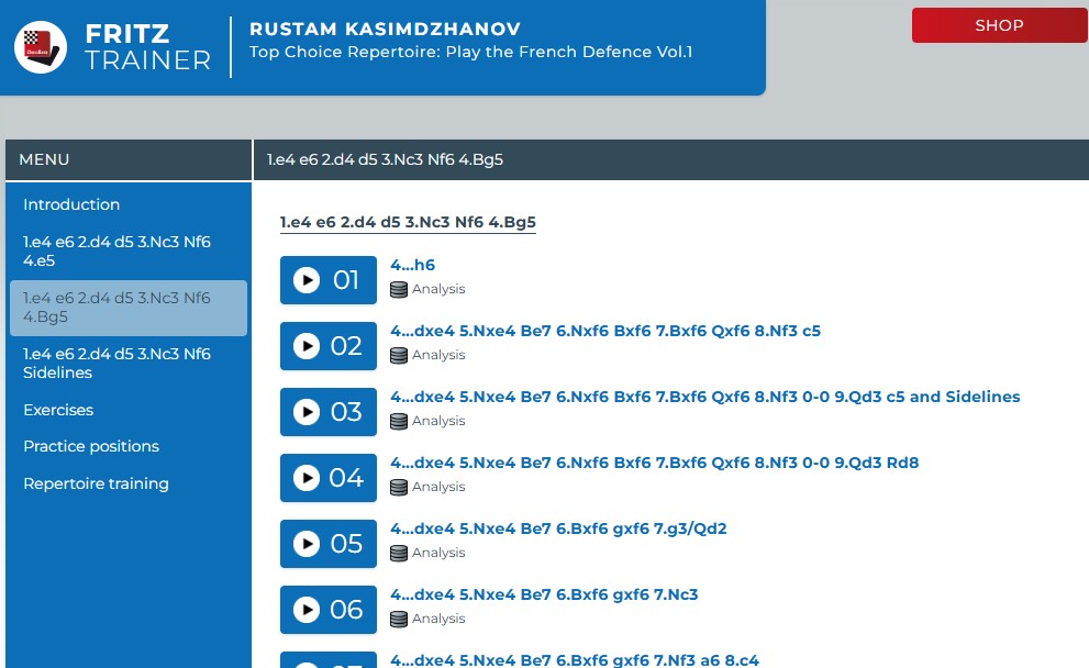 Der Kurs von Kasimdzhanov (Englisch) ist sehr ausführlich und bietet ein sehr hohes Niveau der Varianten mit vielen eigenen Analysen des Autors, der aufgrund seiner Tätigkeit als Trainer und Sekundant als absoluter Experte für Französisch gilt. Man kann den Kurs guten Gewissens als „Grandmaster Repertoire“ bezeichnen. Für Einsteiger ist er aber eher nicht geeignet.
