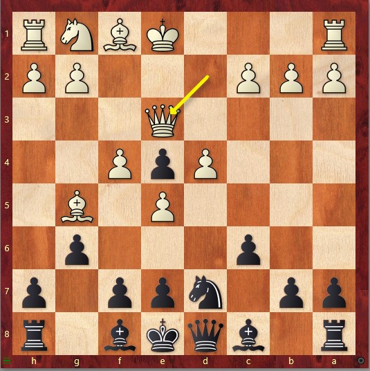 Der Läufer wird ebenfalls aktiviert, und innerhalb von nur fünf Zügen sind alle vorher passiven Figuren ins Spiel gekommen. Nach 14. Se2 Sd8 gelingt es Schwarz, den e6-Bauern zu gewinnen.