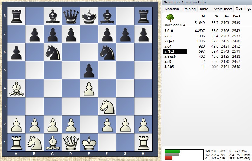 In dieser bekannten Spanisch-Variante wählte Weiß nicht den üblichen Zug 5.0-0, sondern spielte 5.Sc3: