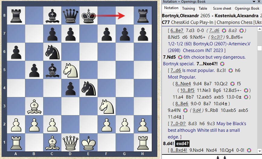 Dieser Springerzug kommt laut Powerbook in der Liste der häufigsten Züge erst an fünfter Stelle. Es gelang ihm damit aber, seine Gegnerin auf weniger bekanntes Terrain zu locken und strategische Fehler zu provozieren.