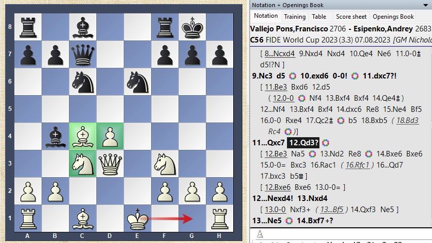 In dieser Stellung wählte Schwarz 12...Sexd4, um zu verhindern, dass Weiß seinen König mit der Rochade in Sicherheit bringt.