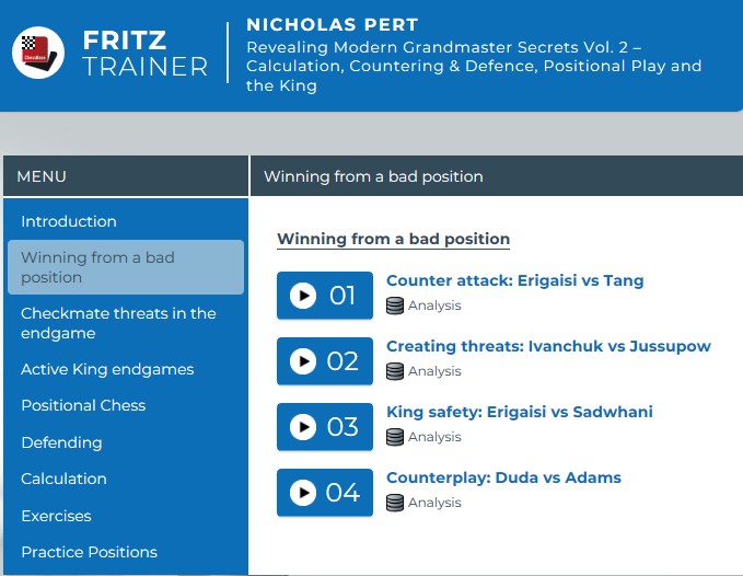 Nicholas Pert ist einer meiner Lieblingsautoren bei ChessBase. Ich mag seinen klaren und sachlichen Stil, der immer von hoher Kompetenz zeugt. Sein Kurs „The French Defence for the Tournament Player“ war einer meiner ersten Fritz Trainer und die Basis meines Französisch-Repertoires. Auch seine „Typical mistakes“ Serie fand ich sehr instruktiv.