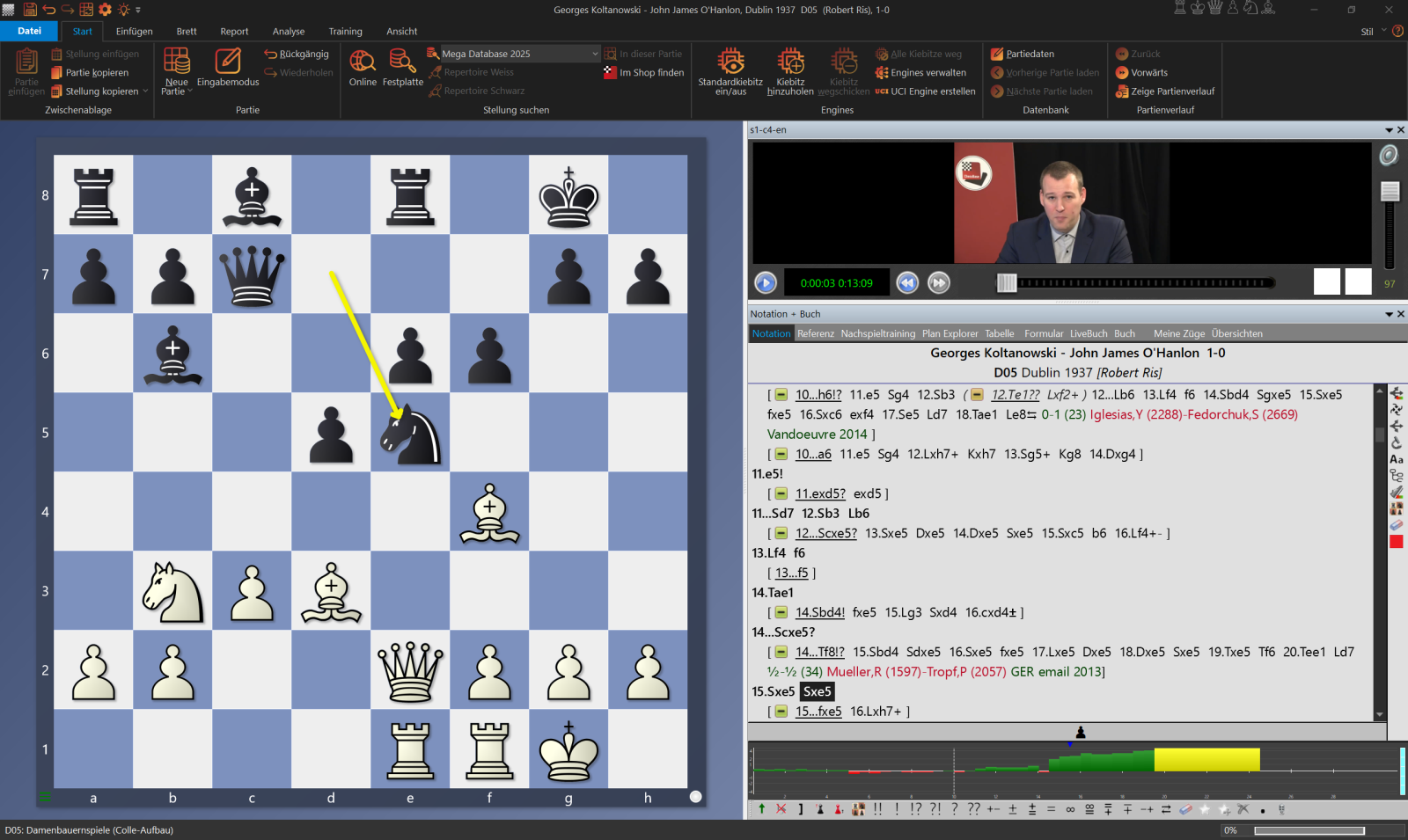Nach einer soliden Vorbereitung verlor ich im 17. Zug völlig den Faden, als ich mit ...Dxf6 meine Bauernstruktur intakt halten wollte, woraufhin Sd7 bereits die Qualität und letztlich die Partie gewann. So startete ich mit einer Niederlage gegen den an Nummer 2 gesetzten Köllner, der heute als einer der größten Spezialisten für diese Variante gilt. Umso gespannter war ich, was Robert Ris in seinem Kurs präsentieren würde und tatsächlich findet sich auch eine Partie von Köllner unter den Beispielen.