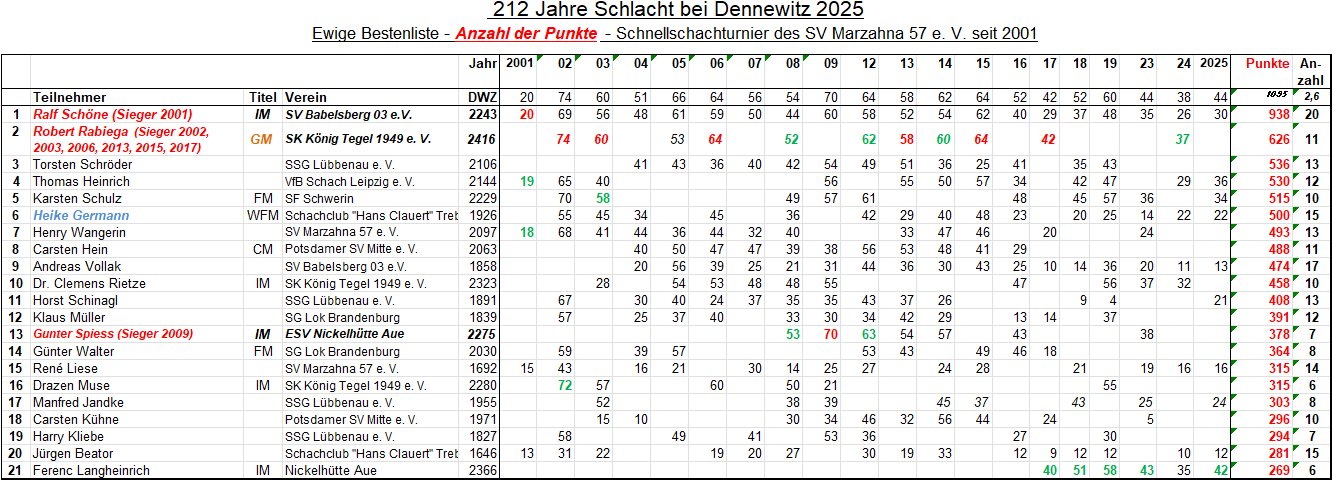 Die nun wahrscheinlich ewige Bestenliste des Turniers wird unangefochten vom „Ewiger Ralf von Dennewitz“ angeführt, vor „General Robert von Dennewitz“ und Torsten Schröder (SSG Lübbenau). (Punkte: erreichter Platz reziprok Anzahl Teilnehmer im jeweiligen Jahr).