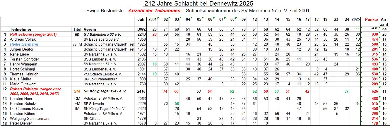 Mit Ausnahme der ersten drei Turniere – und vermutlich auch der Schlacht von 1813 – hat Andreas Vollack (SV Babelsberg 03) an allen folgenden 17 Austragungen teilgenommen. Platz drei in der ewigen Teilnahmeliste teilen sich WFM Heike Germann und Jürgen Beator mit jeweils 15 Teilnahmen – beide waren ebenfalls lange Zeit für den SV Marzahna 57 e.V. aktiv.