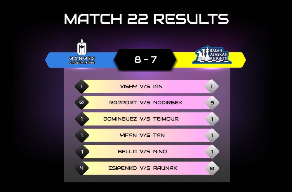 Im Wettkampf zwischen den Ganges Grandmasters und den Alaskan Knights erzielte Andrey Esipenko den entscheidenden Sieg für sein Team, die Ganges Grandmasters. Da Esipenko mit den schwarzen Steinen spielte, erhielt er vier Punkte und glich so die Niederlage seines Mannschaftskollegen Richard Rapport gegen Nodirbek Abdusatorv aus, da diese als Weißsieg nur mit drei Punkten ins Gewicht fiel.