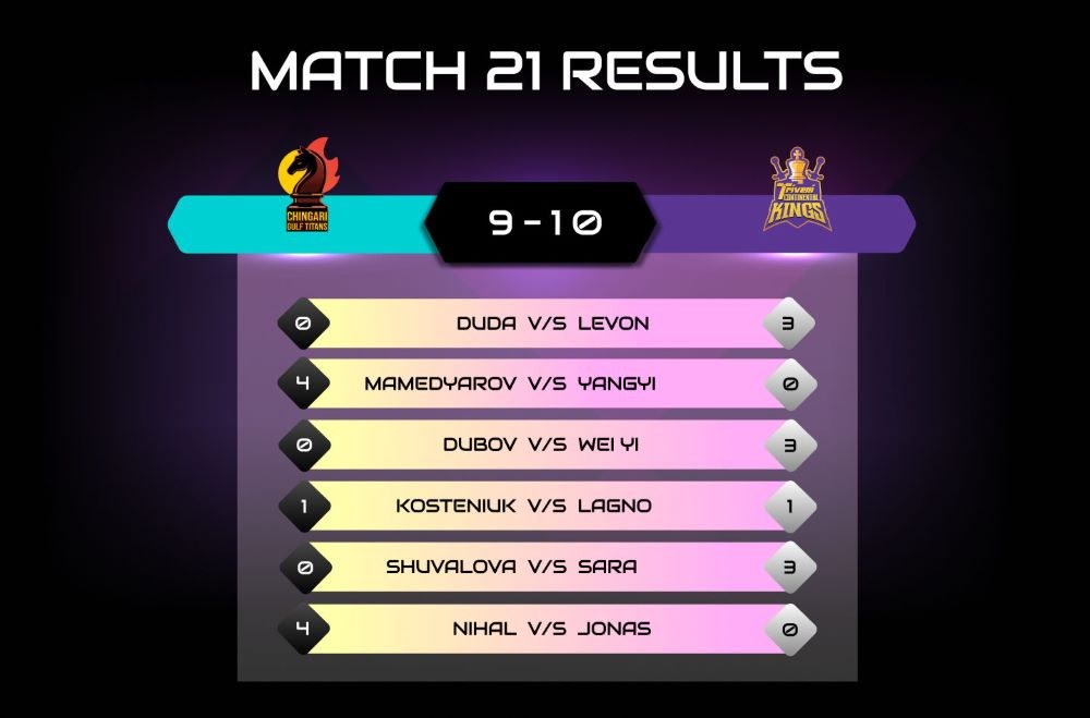 Nihal Sarin feierte einen Sieg gegen den jungen Dänen Jonas Buhl Bjerre. Wei Yi gewann für die Kings gegen Daniil Dubov. Die Partie zwischen Alexandra Kosteniuk und Kateryna Lagno endete remis.