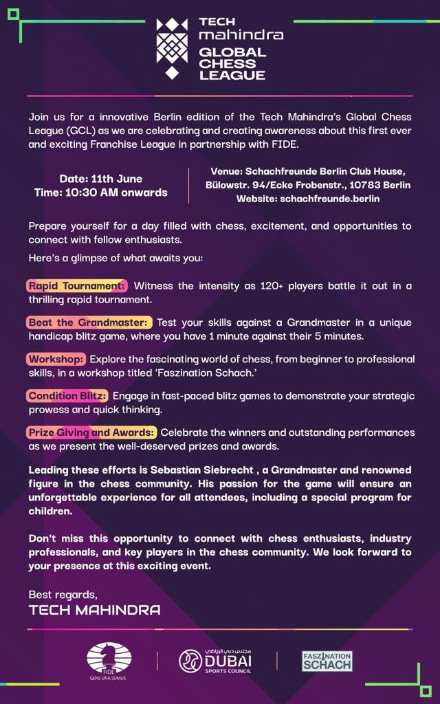 Mit der Global Chess League erscheint in Kürze ein neuer Stern am Turnierschach-Himmel. Die "Global Chess League" ist ein neues Mannschaftsturnier, von Tech Mahindra in Kooperation mit der FIDE ins Leben gerufen. Die erste Ausgabe findet vom 21. Juni bis 2. Juli in Dubai, im Dubai Chess & Culture Club, in Zusammenarbeit mit dem Dubai Sports Council.
