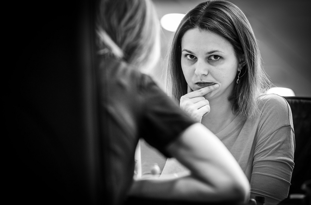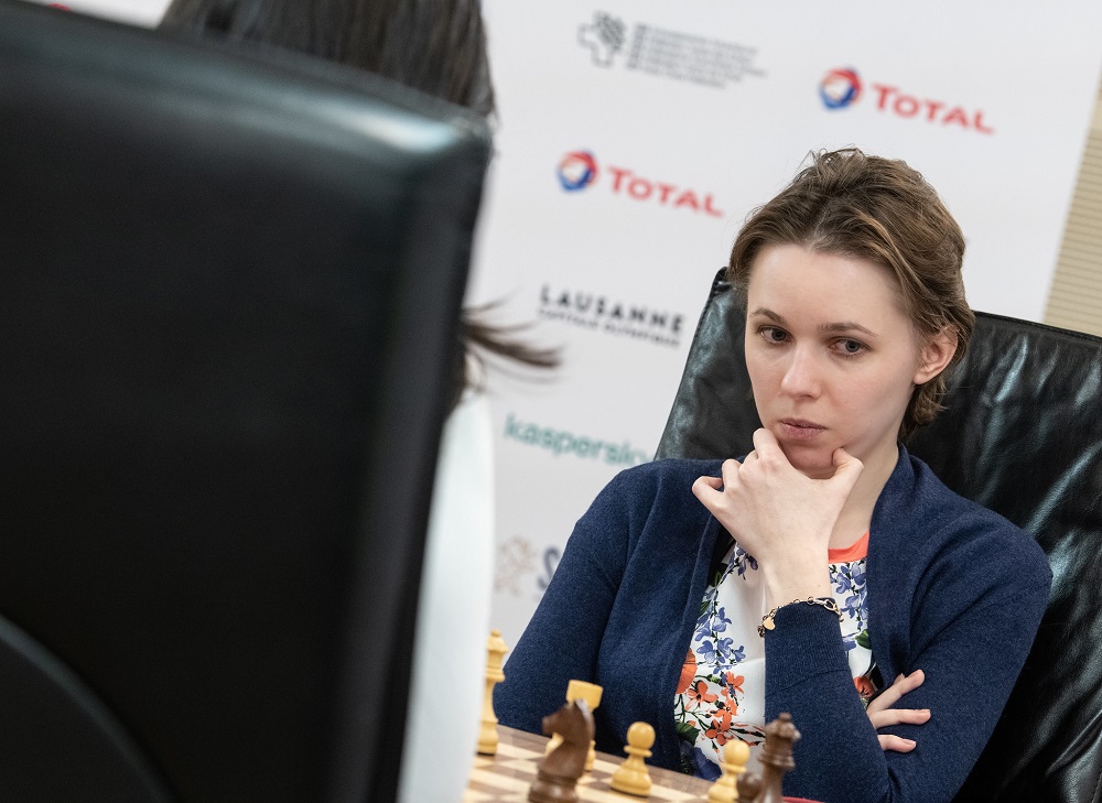 In ihrer Partie gegen Nana Dzagnidze hatte Anna Muzychuk kurz nach dem 20. Zug deutlichen Vorteil, der sich wohl zum Gewinn hätte ausbauen lassen. Der volle Punkt hätte es der Ukrainerin erlaubt, sich als Dritte im Bunde dem Führungsduo Harika/Goryachkina anzuschließen. Doch so kam es nicht. Muzychuk gab leichtfertig ihren Damenflügel auf und verlor schließlich genau deshalb: weil ihre Gegnerin auf der Damenseite mehr Bauern übrig behalten hatte.
