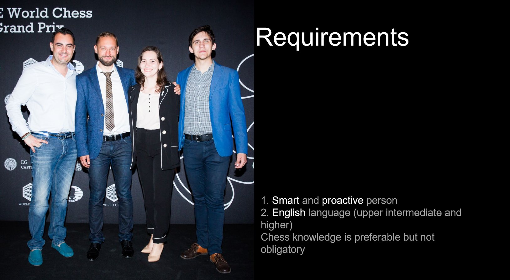 Schicken Sie ihre Bewerbung an Liubov Erikina: projects@worldchess.com