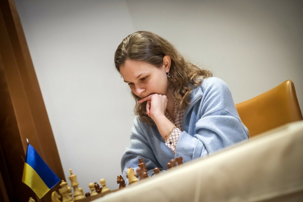 Alina Kashlinskaya und Anna Muzychuk kamen in einem Angenommenen Damengambit zum gleichen Ergebnis. Hier wurde im Endspiel mit Türmen und Springern und symmetrischer Bauernstruktur Frieden geschlossen.