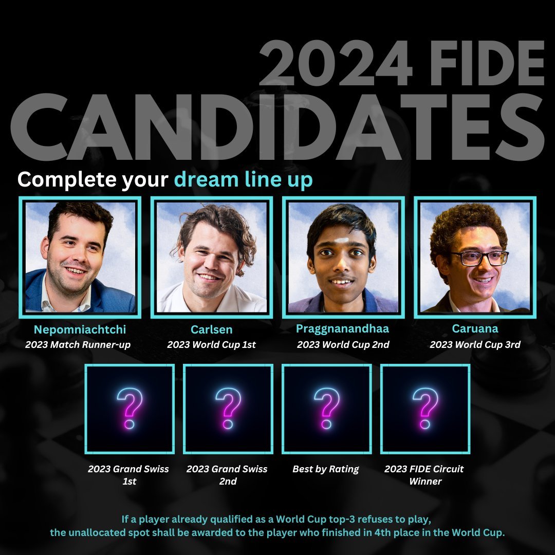 Einige Plätze sind für das kommende Kandidatenturnier schon belegt. Sichere Teilnehmer sind Praggnanandhaa und Fabiano Caruana, die als Zweiter und Dritter des World Cups teilnehmen werden. Magnus Carlsen als Sieger hat bekanntlich keine Lust mehr auf Weltmeisterschaftskämpfe, wird also eher nicht das Kandidatenturnier spielen. In dem Fall rückt der Vierte des World Cups Nihat Abasov nach.