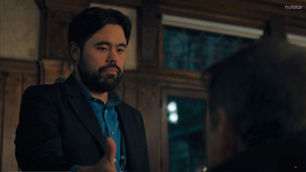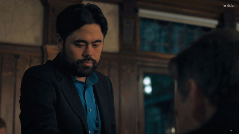 Schachszenen in Film, Fernsehen und in Serien sind nicht immer ein Vergnügen, denn oft stimmen schachliche Details nicht. Doch Nakamura hat am Set vermutlich darauf geachtet, dass Bretter, Uhren, Figuren, Stellungen und auch alles andere möglichst realistisch sind. Hier ein Diagramm der ersten Stellung, die zu sehen ist.