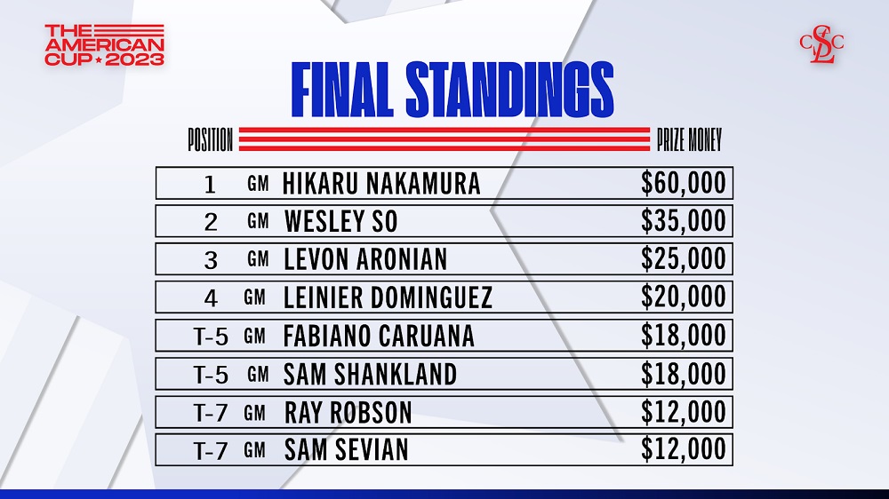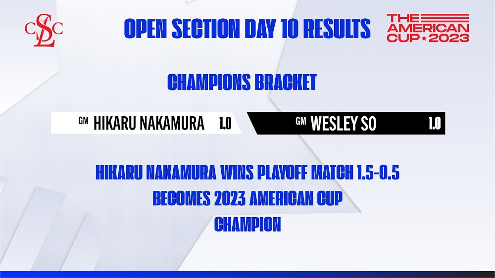 27.03.2023 – Als Sieger der "Champions Bracket" hatte Hikaru Nakamura das erste Finalmatch gegen Wesley So, den Sieger der "Elimination Bracket", am Samstag verloren. Das für diesen Fall vorgesehene zweite Match am Sonntag begann mit zwei 25+10-Partien, die beide remis ausgingen. Weiter ging es mit einem Stichkampf, dessen erste Stufe zwei 10+5-Partien umfasste. Nach einem Remis in der ersten Partie gewann Nakamura die zweite, womit das Turnier dann endgültig beendet war. Nakamura erhielt für seinen Erfolg ein Preisgeld in Höhe von insgesamt 60.000 USD.