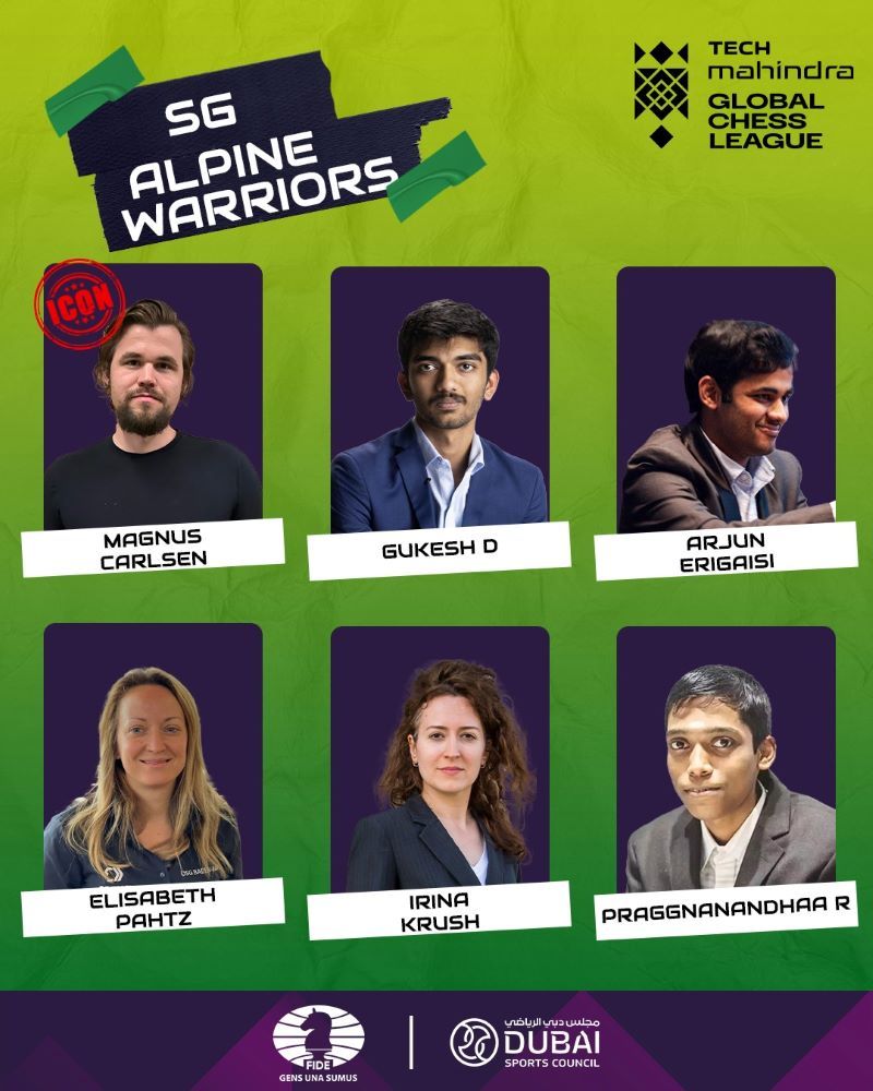 SG Alpine Warriors - GM Magnus Carlsen, GM D Gukesh, GM Arjun Erigaisi, GM Elisabeth Paehtz, GM Irina Krush und GM R Praggnanandhaa