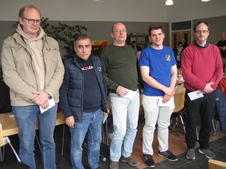 Turniersieger wurde Samir Mohammad (vorne links): Der syrische FM, der sein Land bei 3 Olympiaden vertreten hat, lebt seit 7 Jahren in Deutschland. Er gewann die ersten 5 Runden, zum Teil mit einiger Ausdauer in remislichen Endspielen, und ließ das Turnier dann mit 2 Remisen ausklingen.