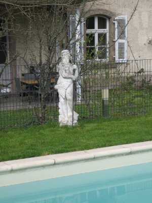 Innen und außen bestach das Schloss durch eine interessante Mischung aus alten und modernen Einrichtungsgegenständen: Hier wacht Neptun (oder ist es Poseidon?) über den Swimmingpool im Garten.