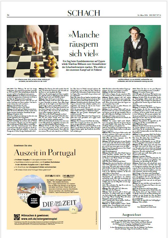 Peter Kümmerl und Ulrich Stock haben vor Beginn des Turniers für die Hamburger Wochenzeitschrift "DIE ZEIT" noch ein Interview mit dem deutschen Großmeister geführt, das in der aktuellen Printausgabe veröffentlich wurde. Tatsächlich hat Matthias Blübaum als einziger Spieler bisher zweimal den Titel eines Europameisters gewonnen, aber das bleib zumindest von der Nicht-Fachpresse bisher weitgehend unbemerkt. Darauf angesprochen weist Matthias Bliübaum aber daraufhin, dass der Europameistertitel aufgrund des Formats einen viel geringeren Stellenwert hat, als der Kampf um den Weltmeistertitel.