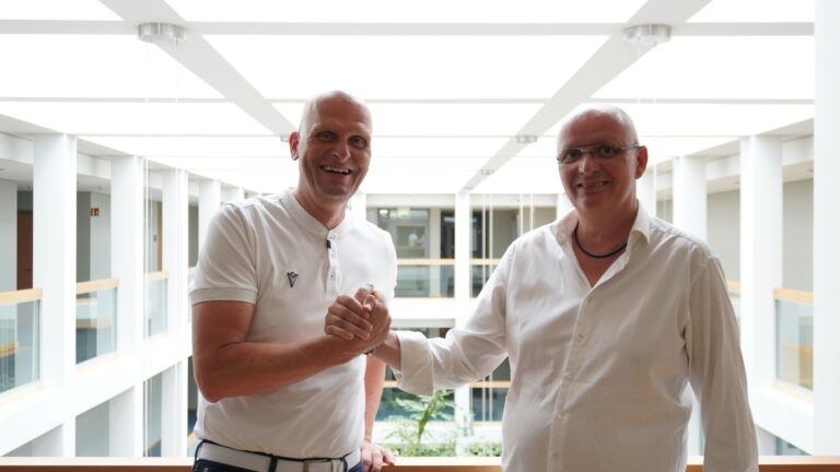 Andreas Spengler (Geschäftsführer peak zone GmbH) und Michael S. Langer (NSV-Präsident) beim Handschlag zum Vertragsabschluss in der Akademie des Sports in Hannover. (Foto: Niklas Prahl)