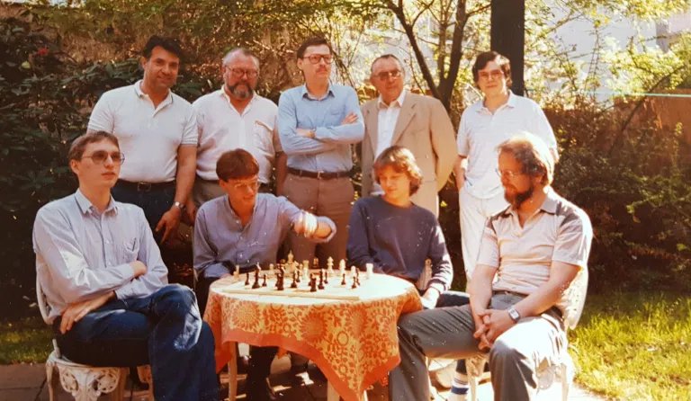Schacholympiade Dubai 1986, links Stefan Kindermann am ersten Brett für Deutschland, wo er 7,5 Punkte aus 13 Partien erzielte. Außerdem (v.l.) Klaus Bischoff, Hans-Joachim Hecht (stehend), Jörg Hickl (verdeckt) und Detlef Heinbuch. | via Wikipedia