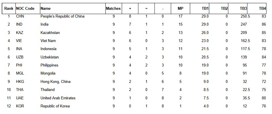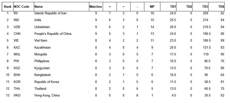 Indien erreichte drei Unentschieden und lag am Ende einen Punkt hinter dem Sieger. Trotz der Niederlage gegen den Iran schafften die Sieger der 44. Schacholympiade, Usbekistan, den Sprung auf das Podium und gewannen Bronze.