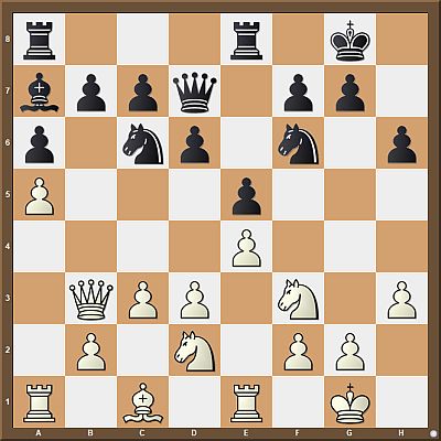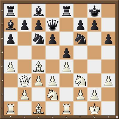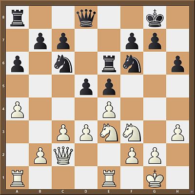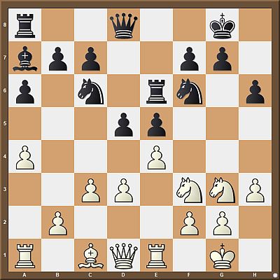 Schwarz muss seine Figuren ein wenig umgruppieren, da sich der Springer auf c6 nie wohlfühlen würde. Nach einem komplizierten Kampf gewann Carlsen eine schöne Partie, siehe Esipenko,A - Carlsen,M 0-1.
