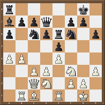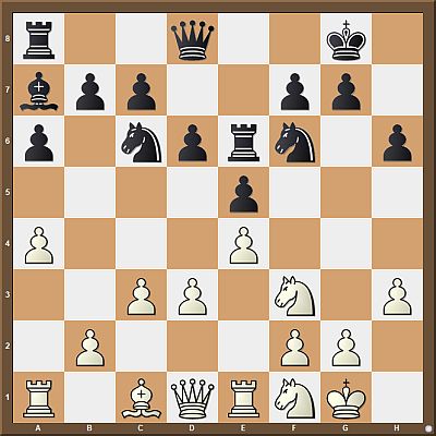 Ein Versuch, eine leichte Schwächung der schwarzen Stellung zu provozieren. 14...b5!. (14...Ne7?! ist eine Ungenauigkeit. Weiß hat nach 15.Sf1 einen gewissen Vorteil. Es ist ratsam, die Kommentare von einem der besten Spieler der Welt, Alireza Firouzja, zu seinem Sieg in Firouzja,A - Tari,A 1-0 zu lesen). 15.Ta1. Es sieht seltsam aus, einfach zurückzugehen und ein Tempo zu verlieren, aber jetzt macht der Bauer auf b5 einige Probleme für Schwarz. Nachdem Weiß a4 überdeckt hat, will er Druck auf der a-Linie ausüben, kombiniert mit Spiel am Königsflügel. 15...Tae8!?. Ein aktiver Zug, der ein gewisses Angriffspotenzial des Turms e6 in Reserve hält - Tg6 irgendwann oder nach ...d5/...dxe4, gefolgt von Td6. Siehe die Details in So,W - Nakamura,H 1/2.