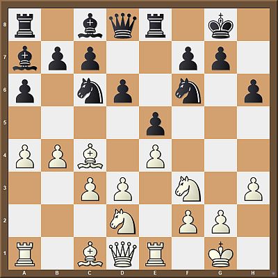 12.a5!?. Der Sinn der weißen Strategie ist, dass der Bauer a5 einen gewissen Raumvorteil sichert, der für Schwarz in manchen Endspielen unangenehm sein könnte. Nun ist das solide 12...Tb8 gefolgt von ...Le6 auch in Ordnung, wie in meiner Partie Chigaev,M - Grigoriants,S 1/2, aber am genauesten ist 12...b5!, was tatsächlich ein Bauernopfer bedeutet.