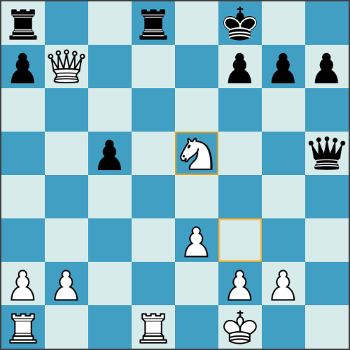 Schwarz am Zug ist überrascht über den letzten Zug von Weiß Tf8, grübelt und gibt in dominanter Stellung entnervt auf. Rettung: ... Dd8, Tf6+ Dxf6, Lxf6 Lf7 und im nächsten Zug holt sich Schwarz wieder die Dame ab! Das Matt sollte dann bald folgen.