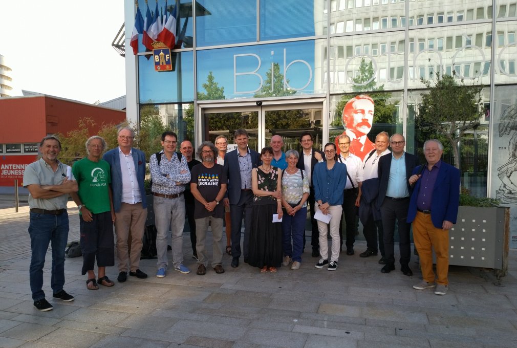 Gruppenphoto der Tagung der CH&LS am 2.9.2023 in Belfort. Ganz rechts Willi Icklicki. Zweiter von links ist Dr. Jurgen Stigter aus Amsterdam, der eine ähnlich bedeutende Sammlung von Schachliteratur besitzt wie Lothar Schmid (*1928–=2013) in Bamberg. Rechts neben ihm George Bertola, der Chefredakteur von Europe Échecs.