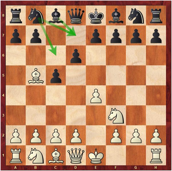 Das eröffnungstheoretische Material ist in die Abzweigungen 3…Sc6, 3…Ld7 4.Lxd7 Dxd7, 3…Ld7 4.Lxd7 Sxd7 sowie 3…Sd7 aufgeteilt. Im Zuge dieser Rezension möchte ich gerne auf die Variante mit 3…Sc6 eingehen, die ich selber auch in meiner eigenen Praxis anwende und auf Grundlage des Buches von Kotronias „Beating the Anti-Sicilians“ (Quality Chess 2015) gelernt und analysiert habe. Die Hauptvariante des Buches folgt auch der hier auf der DVD besprochenen Hauptvariante des Abspieles mit 3…Sc6, welche durch die folgenden Züge charakterisiert ist: 1.e4 c5 2.Sf3 d6 3.Lb5+ Sc6 4.0-0 Ld7 5.Te1 Sf6 (oder a6 zuerst) 6.c3 a6 7.Lf1 Lg4 8.h3 Lxf3 9.Dxf3