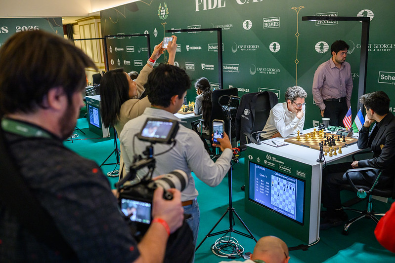 06.04.2026 – Anish Giri überzeugte mit seinen Verteidigungskünsten im Endspiel mit Turm gegen Läufer gegen Javokhir Sindarov und hielt das Remis – erst die zweite Partie, die Sindarov nicht gewann. Vor dem Ruhetag am Montag spielte Blübaum Remis gegen Hikaru Nakamura und Wei Yi überzeugte mit seinem ersten Sieg des Turniers gegen Andrey Esipenko. Fabiano Caruana konnte mit seinem Remis gegen Praggnanandhaa den Abstand zu Sindarov nicht verkürzen. | Foto: FIDE / Michal Walusza