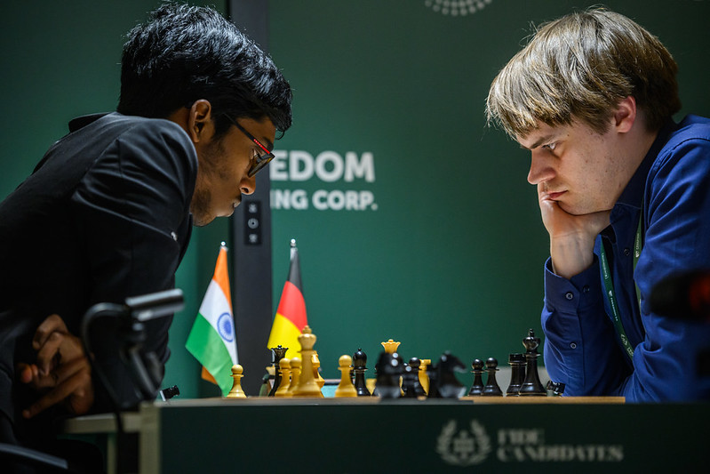 Für Anish Giri wird auch noch etwas anderes schwieriger. Sein Ziel ist wahrscheinlich nicht der inoffizielle Remiskönig-Titel, sondern die Verfolgungsjagd von Javokhir Sindarov. Mit einem seinem Remis gegen Andrey Esipenko erhält er nur den Status Quo, der ohnehin nicht allzu rosig für ihn aussah. Um Sindarov noch einzuholen, müsste er in den letzten drei Runden zwei Punkte mehr erspielen als Sindarov. Ein Sieg im direkten Duell müsste auf alle Fälle her.