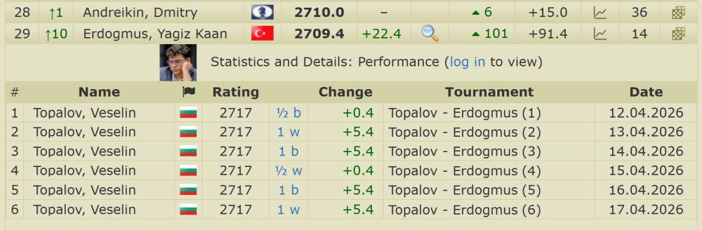 in der Live-Welt-Rangliste übersprang Erdogmus die Marke von 2700 mit seinem Sieg in der fünften Partie des Wettkampfs gegen Topalov, die am 16. April 2026 gespielt wurde. Nach der Partie kam er auf 2704, und da Erdogmus 3. Juni 2011 geboren wurde, war er an diesem Tag 14 Jahre, 10 Monate und 13 Tage alt.