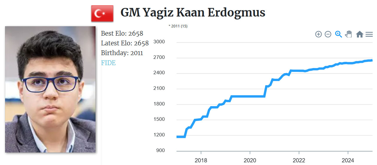 Mehr als 45 Punkte auf 2700-Niveau zu gewinnen, ist selbst für ein Ausnahmetalent äußerst schwierig. Allerdings hat Erdoğmuş die 2700-Marke fast ein ganzes Jahr früher überschritten als der bisherige Rekordhalter Wei Yi.