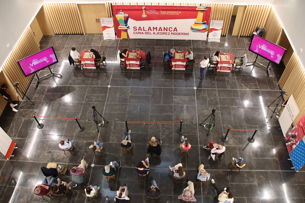 30.04.2023 – Das Großmeisterturnier des Schachfestivals in Salamanca ist am Samstag mit den Runden 6 und 7 zu Ende gegangen. Am Ende waren der Russe Kirill Alekseenko und der Spanier Jaime Santos mit ihren Scores von jeweils 5,5/7 zwar punktgleich, doch der Turniersieg wurde Alekseenko zugesprochen, weil er mit fünf gegen vier die größere Anzahl gewonnener Partien vorzuweisen hatte. | Fotos: Veranstalter