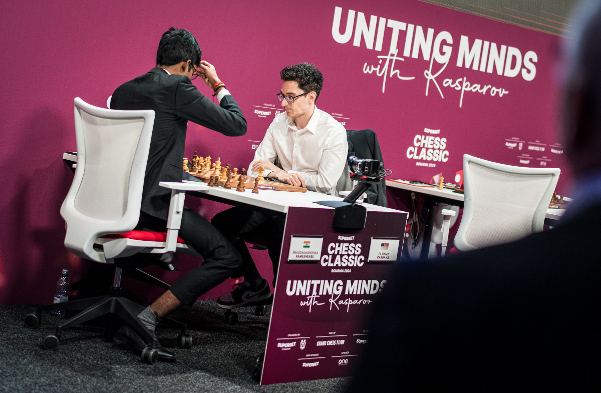 Fabiano Caruana gegen Praggnanandhaa Rameshbabu während des Tie-Breaks der Superbet Chess Classic 2024 | Foto: Lennart Ootes