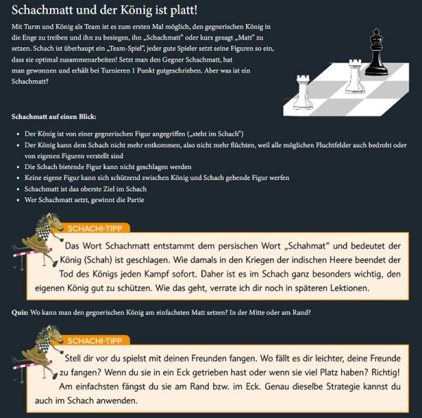 Insgesamt gibt es wenige Stellen, an denen ich noch Optimierungspotential sehe. Aufgefallen ist mir etwa, dass ausgerechnet bei der Erklärung des Mattbegriffes eine Illustration steht, die gerade kein Matt darstellt…