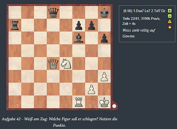 Bei vielen (aber nicht allen) Stellungsbildern kann man im Browser online eine “Fritz”-Engine zuschalten. Diese sehr schöne Option wird sich bei komplexeren Stellungen noch viel sinnvoller einsetzen lassen. Eine kurze Erklärung zur Anwendung dieses Tools und zum Inhalt des Bewertungsfensters wäre allerdings zu wünschen.