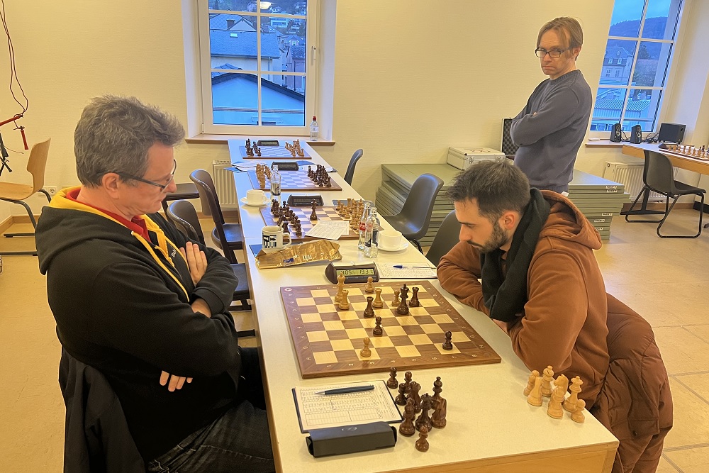 Auf diesem Foto sieht man die längste Partie des Wettkampf zwischen IM Michael Wiedenkeller und FM Dorian Micottis mit Ken Adam aus der Mannschaft Echternach II als Zuschauer.
