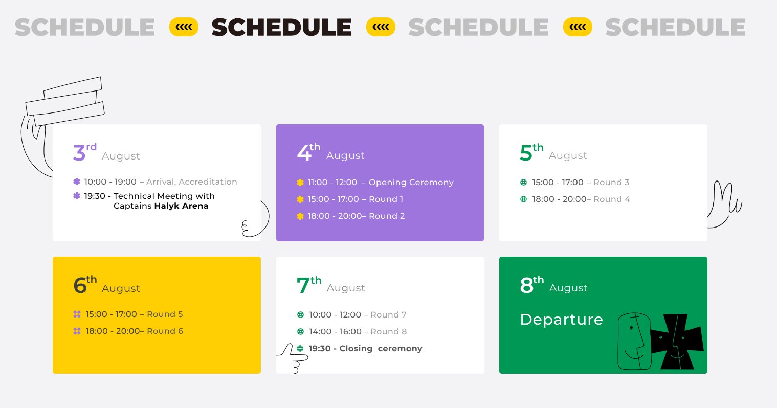 Das bevorstehende Turnier wird einmal mehr beweisen, dass der Liebe zum Schach keine Grenzen gesetzt sind. So wird zum Beispiel ein Schüler aus Pawlodar, Vadim Derksen, trotz eines gebrochenen Beins nach Aktau reisen, um sein Team nicht im Stich zu lassen. Zwei andere Jungs sind bereit, ihren Geburtstag bei der Weltmeisterschaft zu verbringen, weit weg von zu Hause. Der eine ist Nurislam Ainakul, ein Student aus Shymkent. Der andere ist Ricardo Gael Brito De La O, der aus Mexiko anreisen wird.